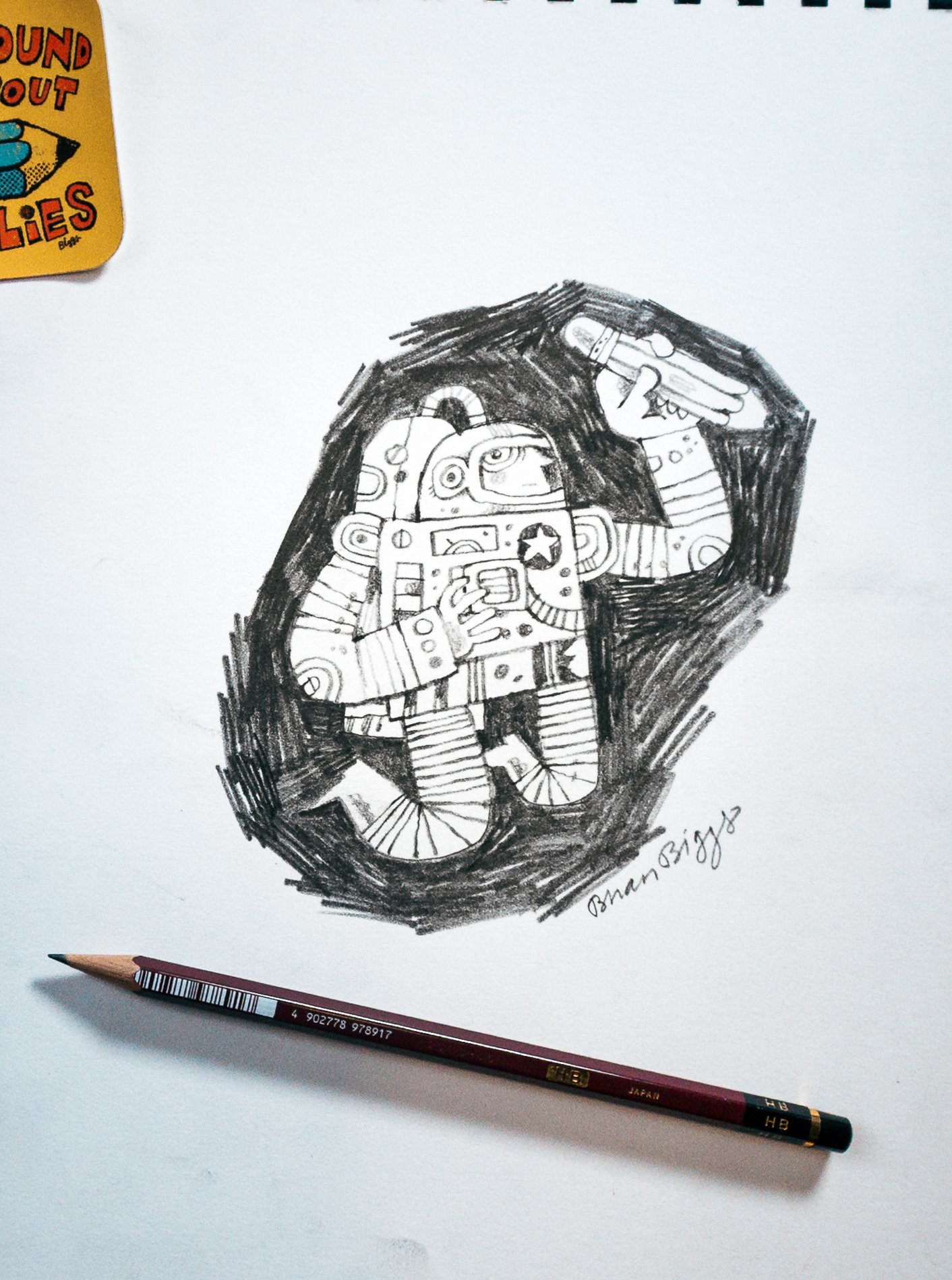 The first astronaut drawn in my Cheap Pencil Challenge video. Drawn with a Mitsubishi Hi Uni HB pencil on Legion Stonehenge stock. 9x12 with the perf on top, I'd be happy to trim it down before shipping. Will include the sticker.